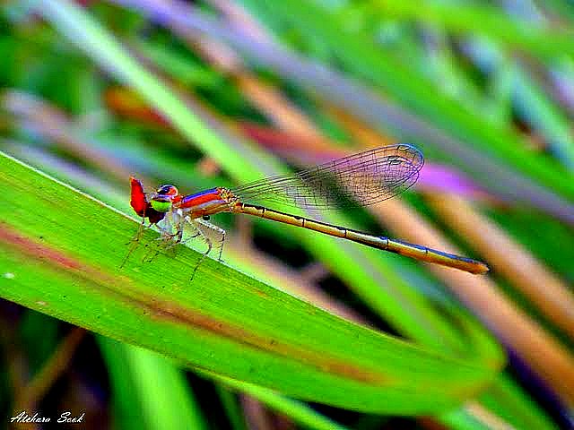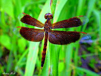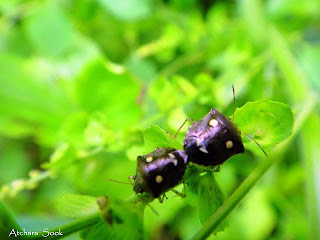 แต่ที่งงไม่หายจนถึงตอนนี้ คือแมลงที่ดูเหมือนมีสองหัวอยู่ในตัวเดียวกัน อันนี้บรรยายตามลักษณะที่มองผ่านเลนส์ของแว่นสายตายาวขนาด 200 นะคะ แต่ดูอีกทีก็เหมือนแมลงสองตัวกำลังหันก้นชนกันอยู่ พอตกใจมันก็บินหนีไปพร้อมกันเหมือนเป็นแมลงตัวเดียว เพ่งมองอยู่นานจึงพบเข้ากับแมลงชนิดเดียวกันนี้อีกหลายตัวในบริเวณนั้น ทุกตัวมีลักษณะเหมือน กันเป๊ะ คือเหมือนมีสองหัวหรือกำลังหันก้นชนกันอยู่อย่างที่บอก แถมยังเกาะพร้อมกันบินหนีพร้อมกัน เกือบจะสรุปเอาเองตามประจักษ์พยานที่เห็นว่า มันคือแมลงตัวเดียวที่มีสองหัวแน่นอน แต่มีคนมาบอกเสียก่อนว่ามันคือแมลงสองตัวที่กำลังผสมพันธุ์กัน ซึ่งดูจากภาพก็น่าจะเป็นอย่างนั้น