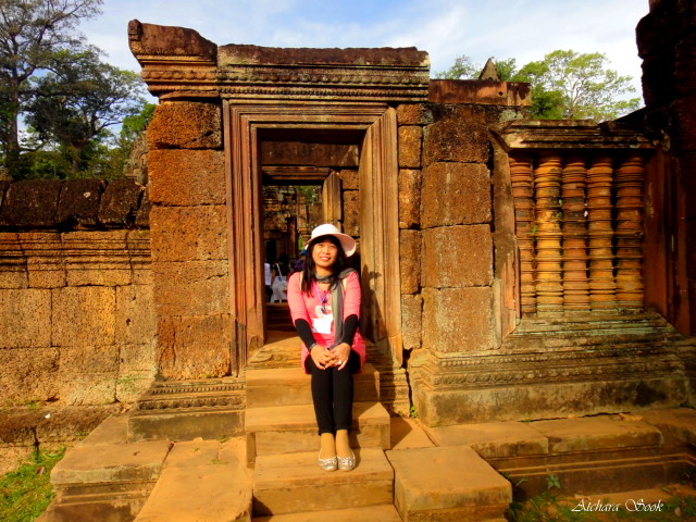 แสงแดดยามเช้าสาดส่องทั่วบริเวณตัวปราสาทที่สร้างด้วยหินทรายสีชมพูทั้งยอดปราสาทหอ        บรรณาลัย  เสาประดับ  ซุ้มประตู หน้าบัน  ทับหลัง แสงเงาที่ตกกระทบทำให้ภาพแกะสลักของเหล่าเทวดานางฟ้าดูงดงามมีมิติคมชัดยิ่งขึ้น  แม้แต่แผ่นอิฐรายทางเดิน และบึงน้ำเล็กๆ ยังสะท้อนเงาอย่างมีชีวิตชีวา ตามซุ้มประตูหรือช่องหน้าต่างบางมุมมีเด็กๆชาวกัมพูชามานั่งให้นักท่องเที่ยวถ่ายภาพ ดูกลมกลืนเสมือนเป็นส่วนหนึ่งของปราสาทได้อย่างลงตัว กลาย เป็นความงดงามที่มีเสน่ห์น่าประทับใจอย่างยิ่ง