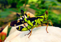 แต่ที่งงไม่หายจนถึงตอนนี้ คือแมลงที่ดูเหมือนมีสองหัวอยู่ในตัวเดียวกัน อันนี้บรรยายตามลักษณะที่มองผ่านเลนส์ของแว่นสายตายาวขนาด 200 นะคะ แต่ดูอีกทีก็เหมือนแมลงสองตัวกำลังหันก้นชนกันอยู่ พอตกใจมันก็บินหนีไปพร้อมกันเหมือนเป็นแมลงตัวเดียว เพ่งมองอยู่นานจึงพบเข้ากับแมลงชนิดเดียวกันนี้อีกหลายตัวในบริเวณนั้น ทุกตัวมีลักษณะเหมือน กันเป๊ะ คือเหมือนมีสองหัวหรือกำลังหันก้นชนกันอยู่อย่างที่บอก แถมยังเกาะพร้อมกันบินหนีพร้อมกัน เกือบจะสรุปเอาเองตามประจักษ์พยานที่เห็นว่า มันคือแมลงตัวเดียวที่มีสองหัวแน่นอน แต่มีคนมาบอกเสียก่อนว่ามันคือแมลงสองตัวที่กำลังผสมพันธุ์กัน ซึ่งดูจากภาพก็น่าจะเป็นอย่างนั้น